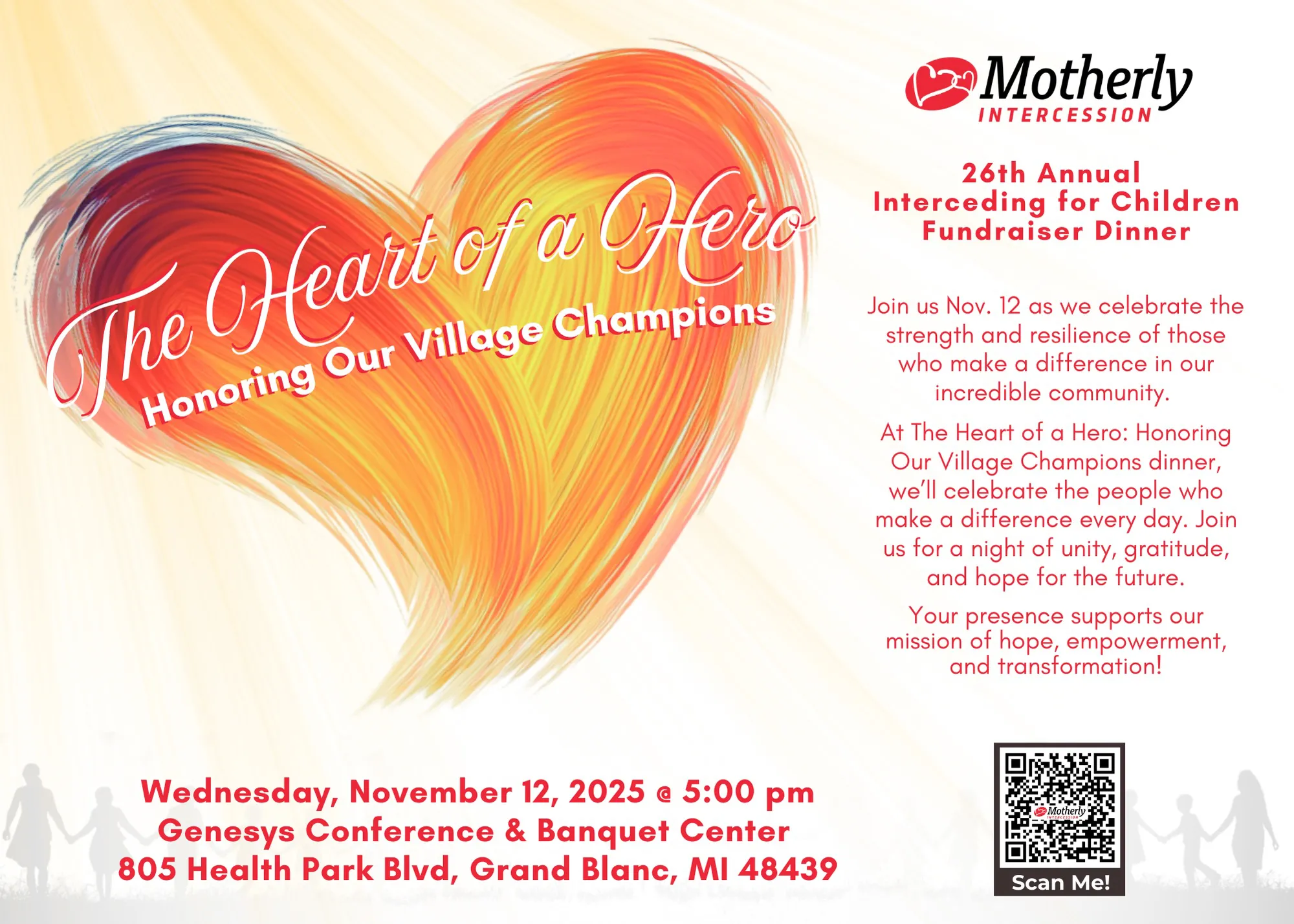 On behalf of Motherly Intercession, I am pleased to invite you to our 26th Annual Interceding for Children Fundraiser DinnerThe Heart of a Hero: Honoring Our Village Champions.