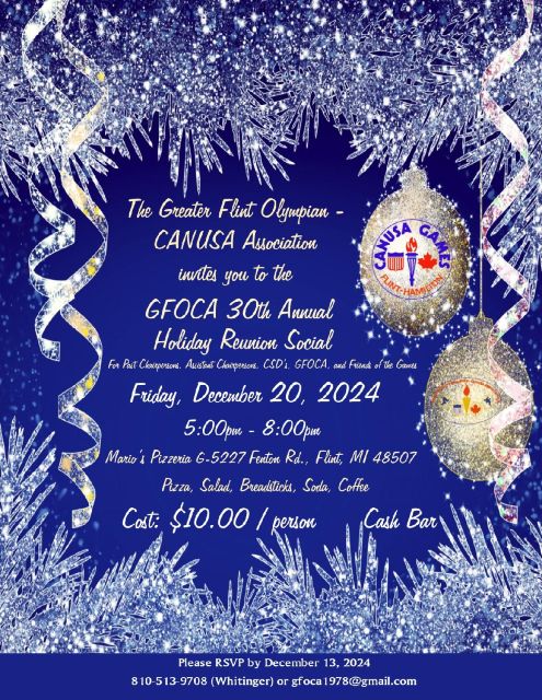 Actually, the yellow bus is a piece of memorabilia from 1987 presented to Tony Sitko (holding the bus) and Chris “Rooster” Daly, who joined us this morning from CANUSA. They noted our Club’s long-standing relationship with the youth of this “longest in the nation” international sports competition and celebrated this in the past week’s Sports Hall of Fame induction and banquet, also attended by Member Joe Farah. (Joe’s sprinting isn’t quite what it was when he “ran faster than the fastest woman”, but he compensates for this with a very quick wit!) Much memory-raking occurred this morning regarding sports, Club history, personal involvement in and with CANUSA, and demographic and structural changes in the past several decades. Tony called our attention to the upcoming Annual Holiday Reunion Social (see copy of flyer in photo below, and note the dates, times, and fare).