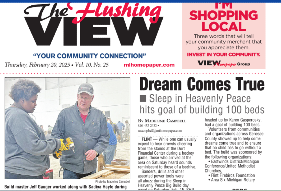 The most recent issue of “The View” (weekly community news organ –see page photo below) featured an article on Sleep in Heavenly Peace and had photos of President Cindy Sullivan and member Jeff Gauger working at SHP’s most recent Build Day. Jeff noted that we plan to deliver and assemble 12 beds today (see FB post/photo HERE), that SHP’s Spaghetti Dinner Fundraiser is this coming Sunday at the Flushing Moose Lodge and that the Moose folks will be sponsoring another Build at their location on Elms Road on April 12, 2025.