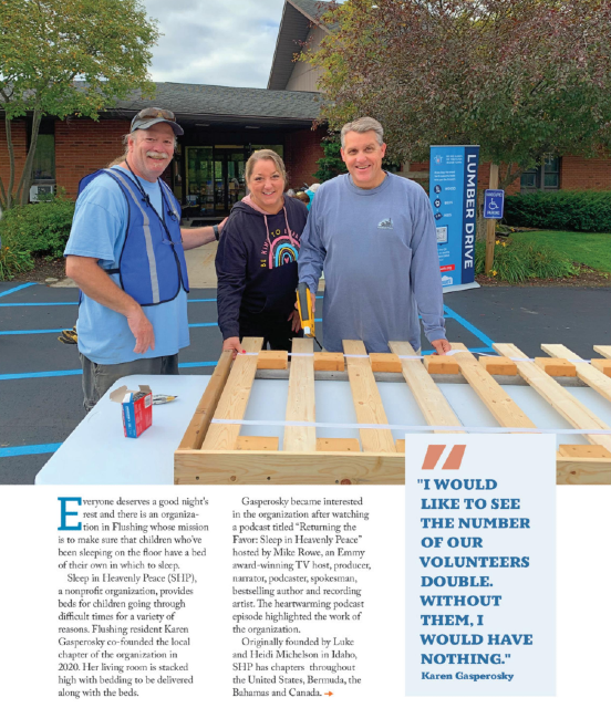 In the magazine’s feature article “A Good Night’s Rest/Sleep in Heavenly Peace” (see page photo in attachment below), Karen Gasperosky (who heads the local chapter of this multi-state organization) notes that 259 beds have been built locally, yet there remains a 300-bed backlog of requests. She values the kids in the community, and she also values each of her volunteers