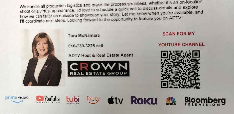 - The American Dream TV show (airing on the Travel Channel and major digital streaming networks nationwide) is a professionally produced 30-minute show every 3 months that emphasizes positive aspects, organizations, stories, and ventures that characterize constructive values in our communities and culture. Emmy-nominated and hosted by Tara, the program can highlight “business, philanthropy, or local impact” to help get important information to a broad audience and engage interest or support, including through social media content. (Interested persons can contact Tara using information in the photo below.)