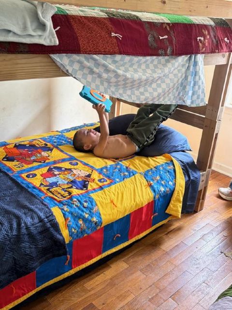 100 of these beds and mattresses have been received already at the Skaff Furniture warehouse space donated for SHP use, and as many as 35 may be assembled in the next few days. [A team from our Club – Jim Reigle, Tim Sullivan, Steve Schlott, Jack Medemar, Phil Holmblade, & Jeff Gauger, who took the picture – are seen in the photo above at the Skaff location. Photos of 2 of the reasons we do this are shown in the photos below.] Great job, folks!!